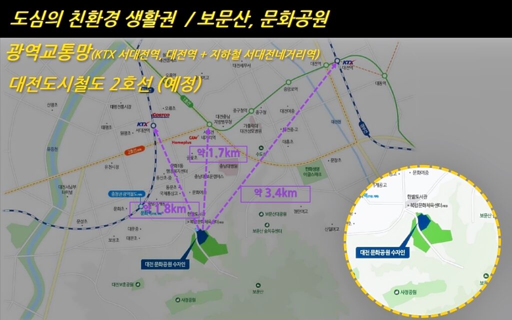 보문산 일대를 포함한 도심융합특구 개발사업, 복합환승센터 건설, 도시철도 2호선 트램 도입, 충청권 광역철도 신설 등의 대규모 개발 사업들이 복합적으로 맞물리며 향후 교통·상업·주거의 삼각축을 이룰 것으로 예상됩니다.