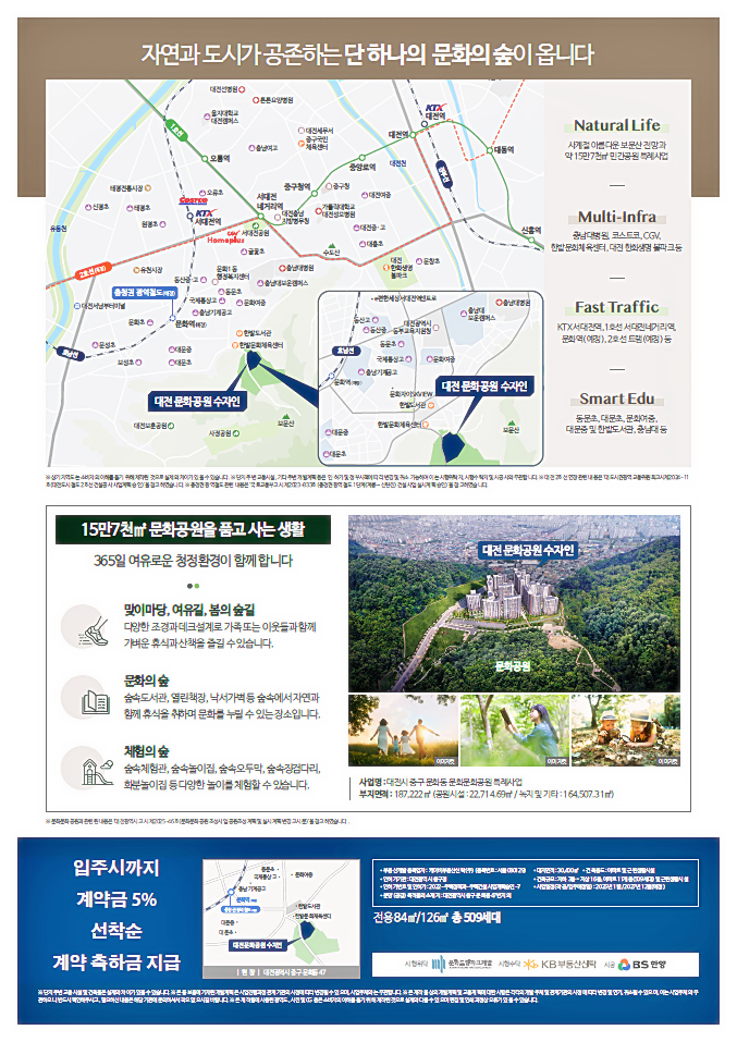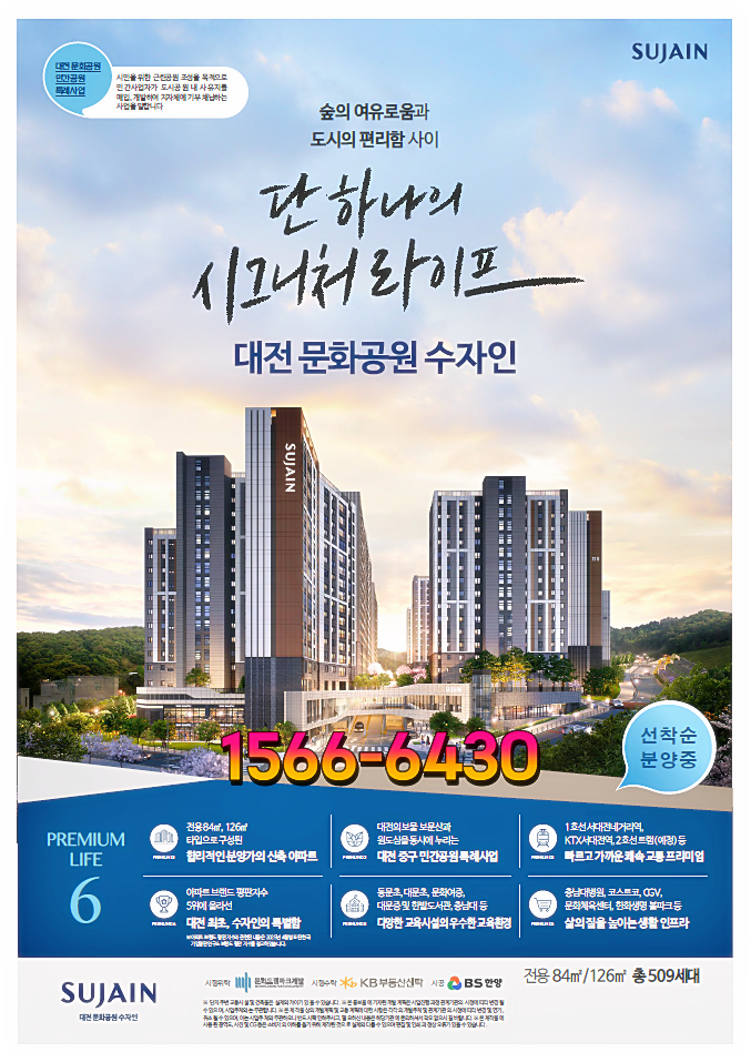 브랜드 ‘수자인’의 프리미엄 가치와 더불어 뛰어난 교통 인프라, 우수한 교육 환경, 풍부한 생활 편의시설, 그리고 민간공원 특례사업을 통한 쾌적한 자연환경까지 두루 갖춘 대전 문화공원 수자인은 단순한 주거 공간을 넘어 미래 가치 증진이 기대되는 투자처로도 손색이 없습니다.