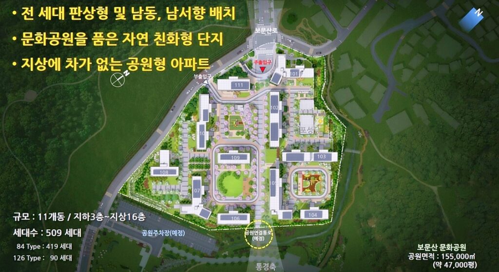 이 단지는 지하 3층에서 지상 최고 16층 규모의 11개 동으로, 총 509세대가 배치되었습니다.