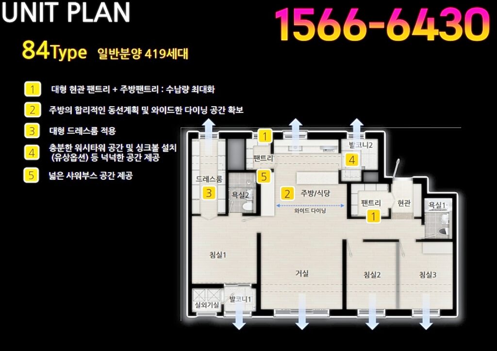 - 84㎡형: 오랫동안 사랑받아온 4Bay 3Room 판상형을 채택하여 전면에 거실과 침실이 배치되어 개방감이 우수했습니다. 주방과 현관에는 대형 팬트리가 마련되어 수납 효율이 극대화되었고요. 넓은 다이닝 공간은 가족 중심의 생활 동선을 편리하게 하였으며, 안방에는 넓은 드레스룸과 독립 샤워부스가 제공되어 일상의 품격을 높였습니다.