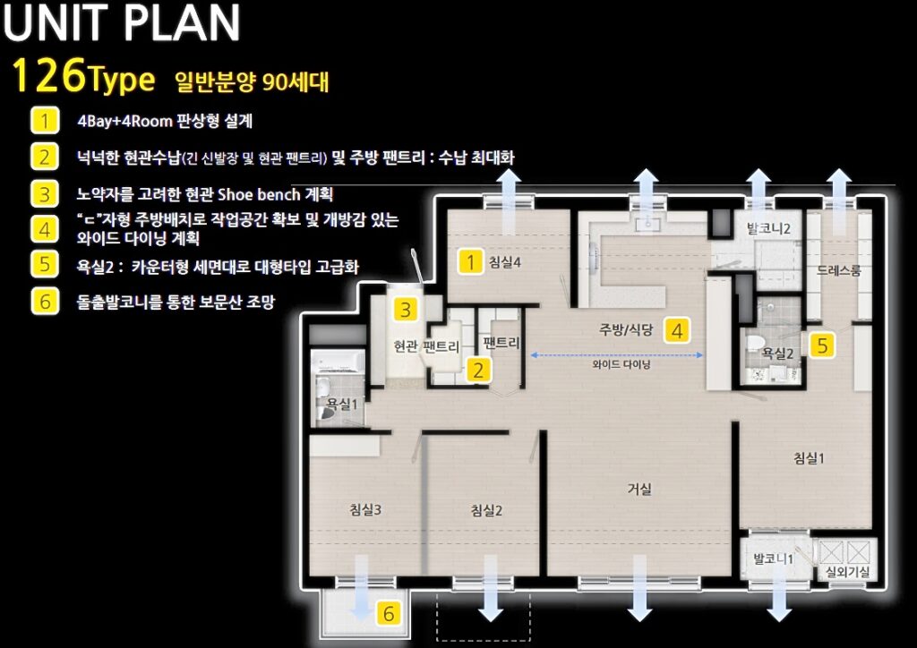 - 126㎡형: 대형 평형으로 다양한 활용이 가능한 4Bay 4Room 판상형 구조를 선택했습니다. ㄷ자형 주방 구조를 통해 개방감이 높았으며, 거실과 침실, 안방이 일렬로 배치되어 조망과 환기가 뛰어났습니다. 특히 일부 세대는 보문산 조망형 발코니를 통해 파노라마 뷰를 확보하여 도심 중심부에서 보기 드문 희소 가치를 가지는 것으로 평가되었습니다.