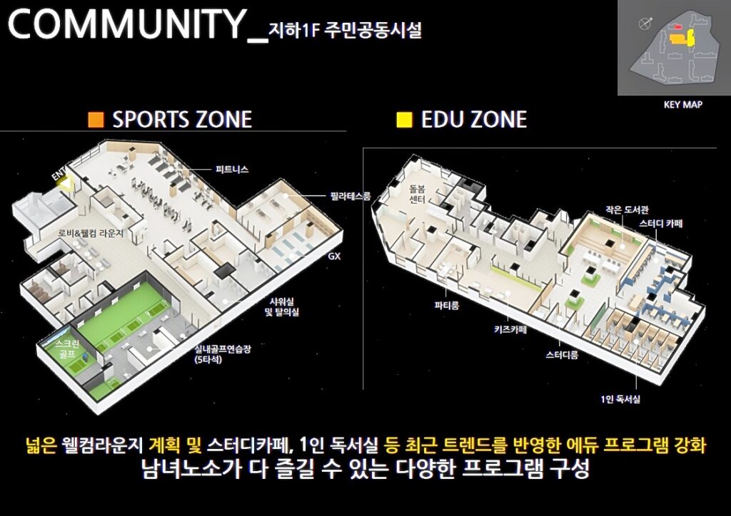 - 에듀 존: 스터디카페, 작은 도서관, 1인 독서실 등을 통해 입주민 누구나 편리하게 학습하고 자기 계발을 할 수 있는 공간을 제공합니다.